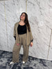 Tailleur gessato con blazer destrutturato senza fodera e senza spalline imbottite, tasche applicate, manica lunga con possibilità di arricciatura con fettuccia e bottone, e pantalone palazzo con tasche laterali ed elastico in vita.