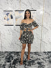 Coord-set composto da crop top con allacciatura ed elastico in vita, con maniche a spalle scoperte e gonna a balze con drappeggio elasticizzato in vita .