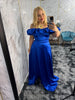 Abito lungo caratterizzato da scollo con spalla scoperta e vaporose balze arricciate, con spalline regolabili, spacco nel davanti e chiusura con zip nel retro.