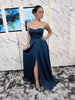 Abito con corpetto con finte stecche, coppette imbottite, spalline regolabili, e gonna morbida con spacco.