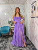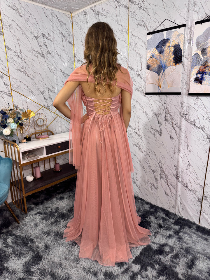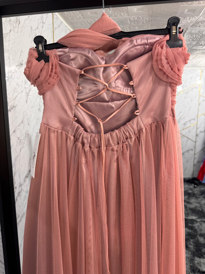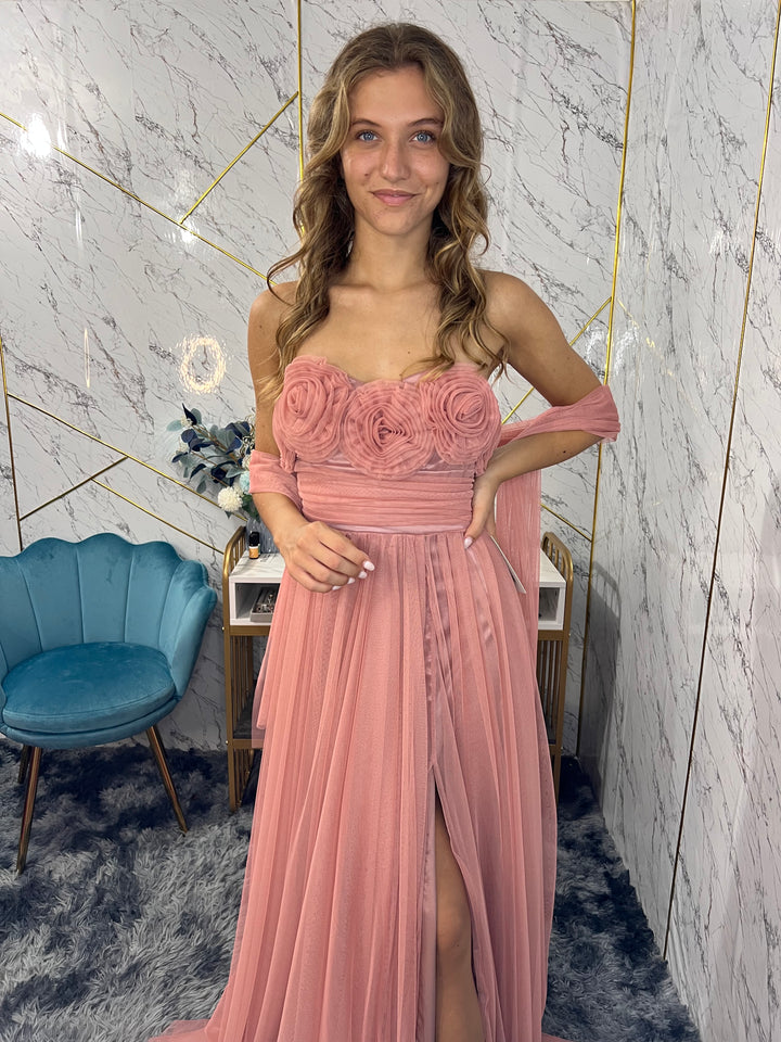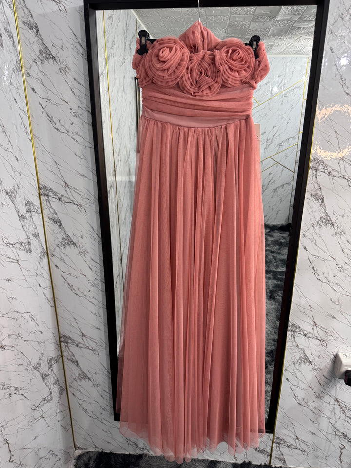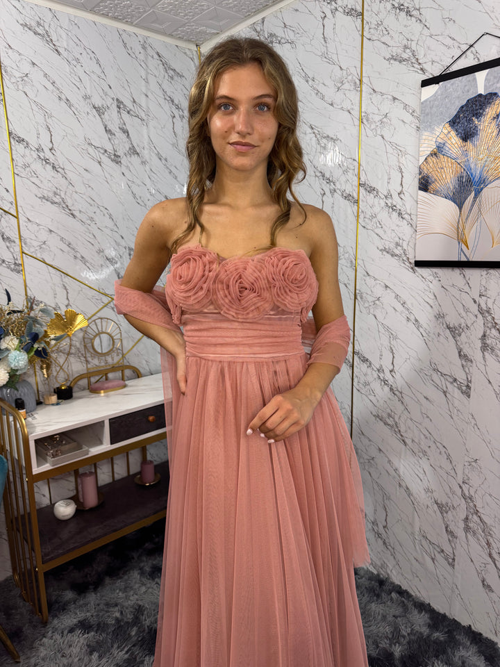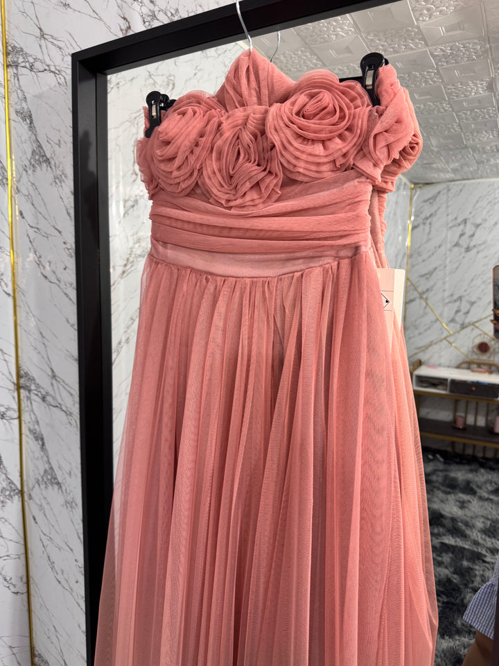 Abito lungo in tulle, foderato, con spacco profondo, corpetto composto da fiori. Si regola dietro con i lacci, ed è elasticizzato nel retro.