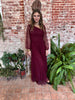 Abito lungo in tulle con scollo asimmetrico nel davanti e scollo a V dietro , coppetta imbottita, maniche velate a sbuffo , gonna morbida e cinturina velata in vita.