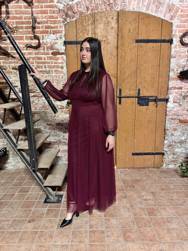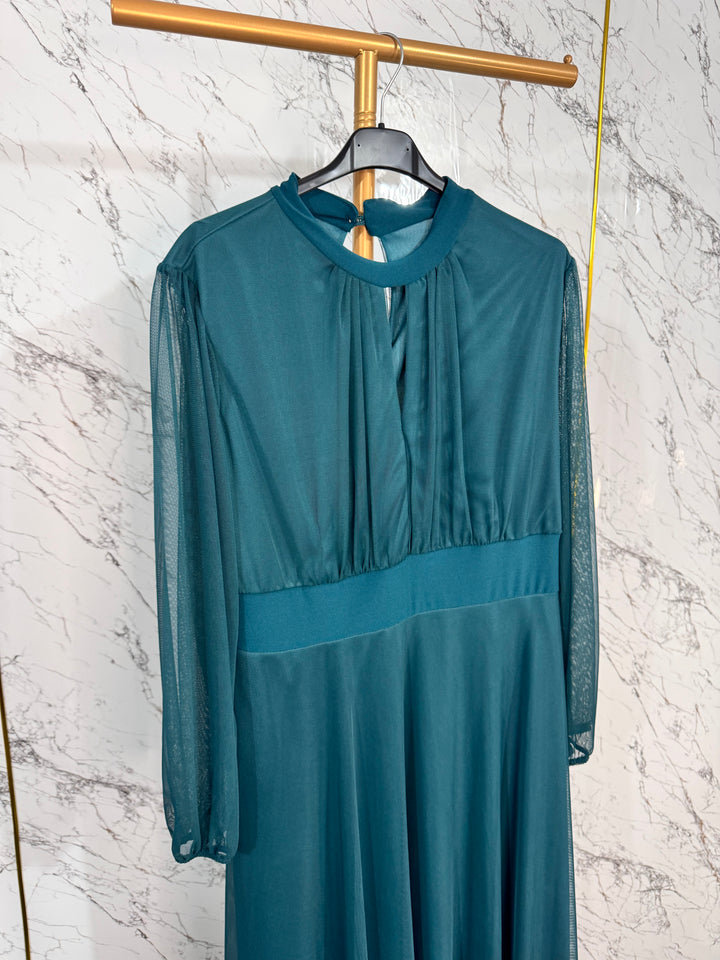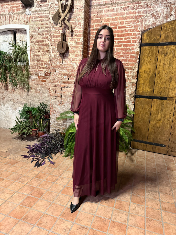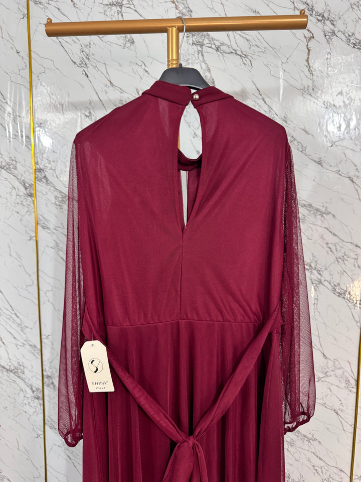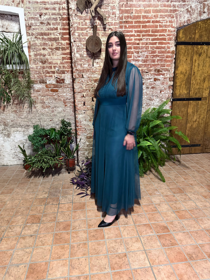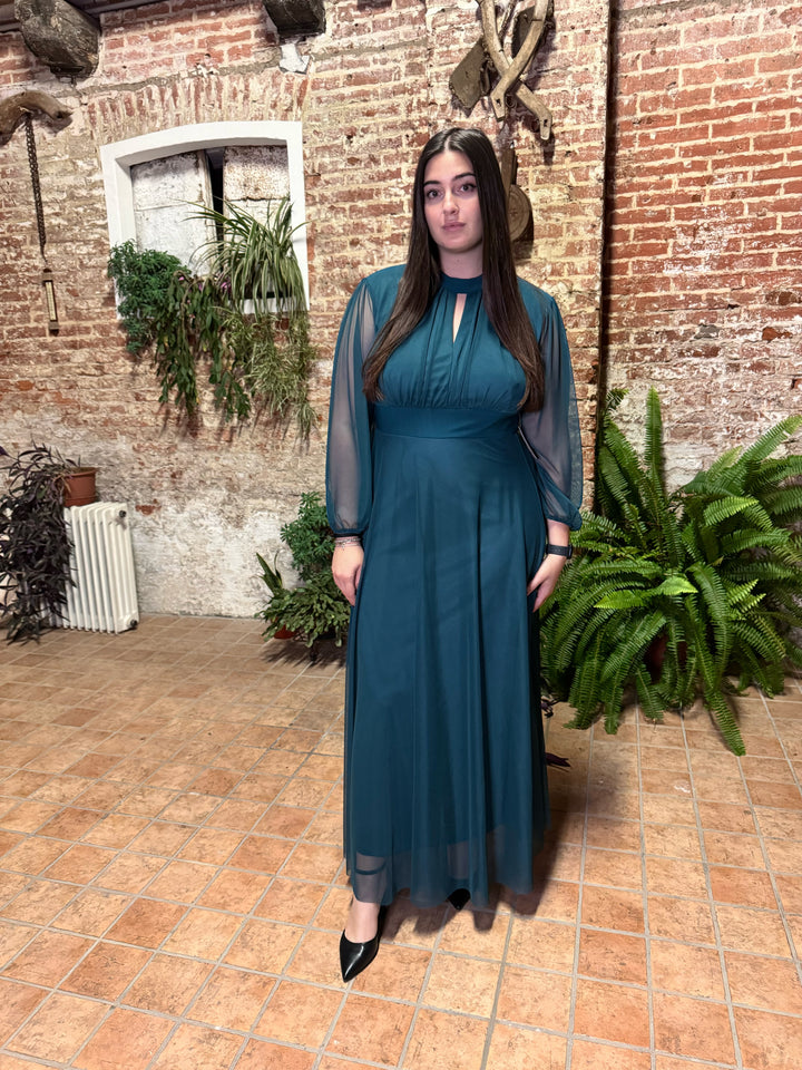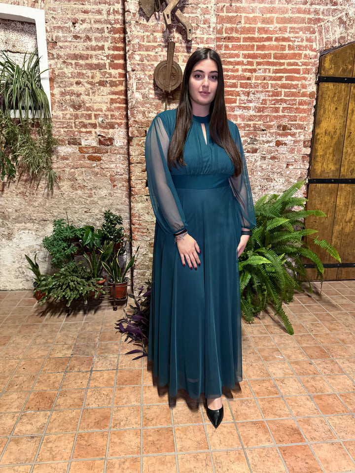 Abito in tulle con mezzocollo rotondo con apertura nello scollo, manica lunga velata con bottone in chiusura dietro, e cinturina in vita.