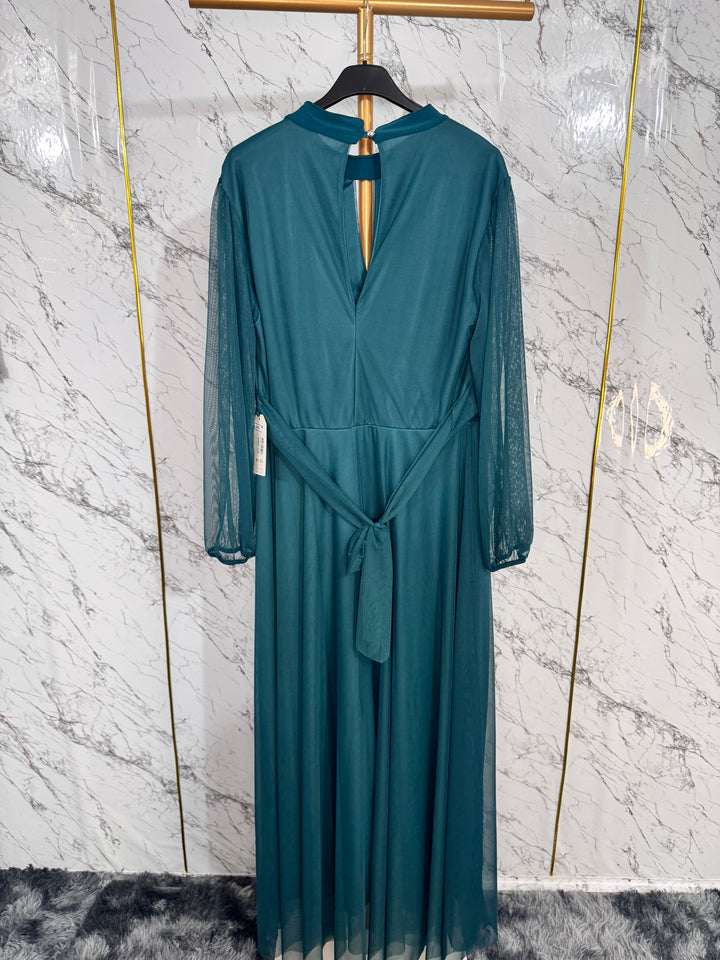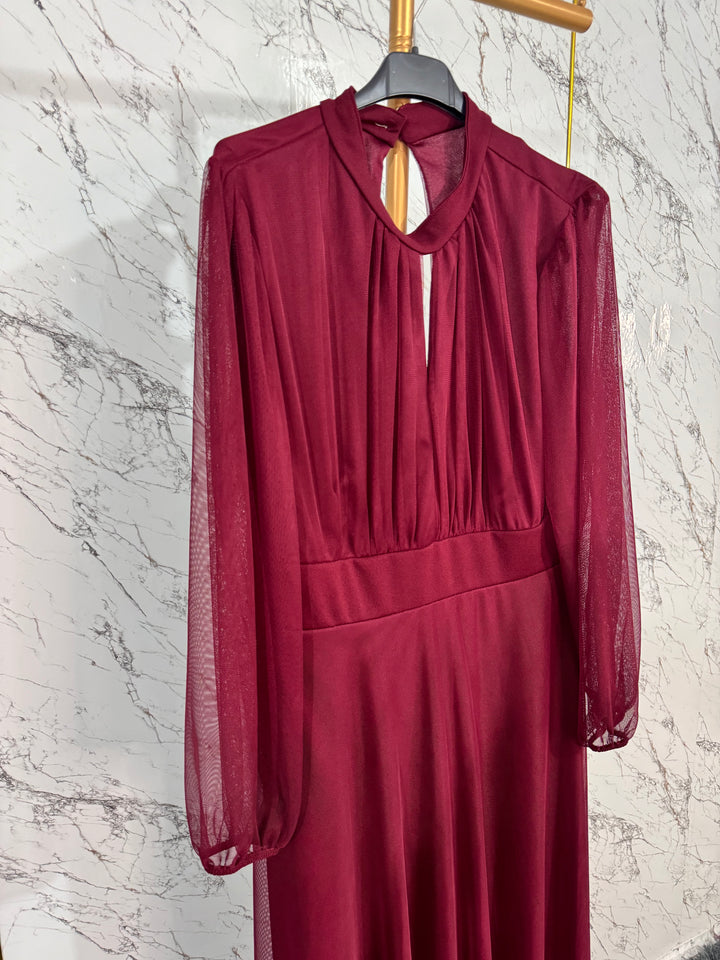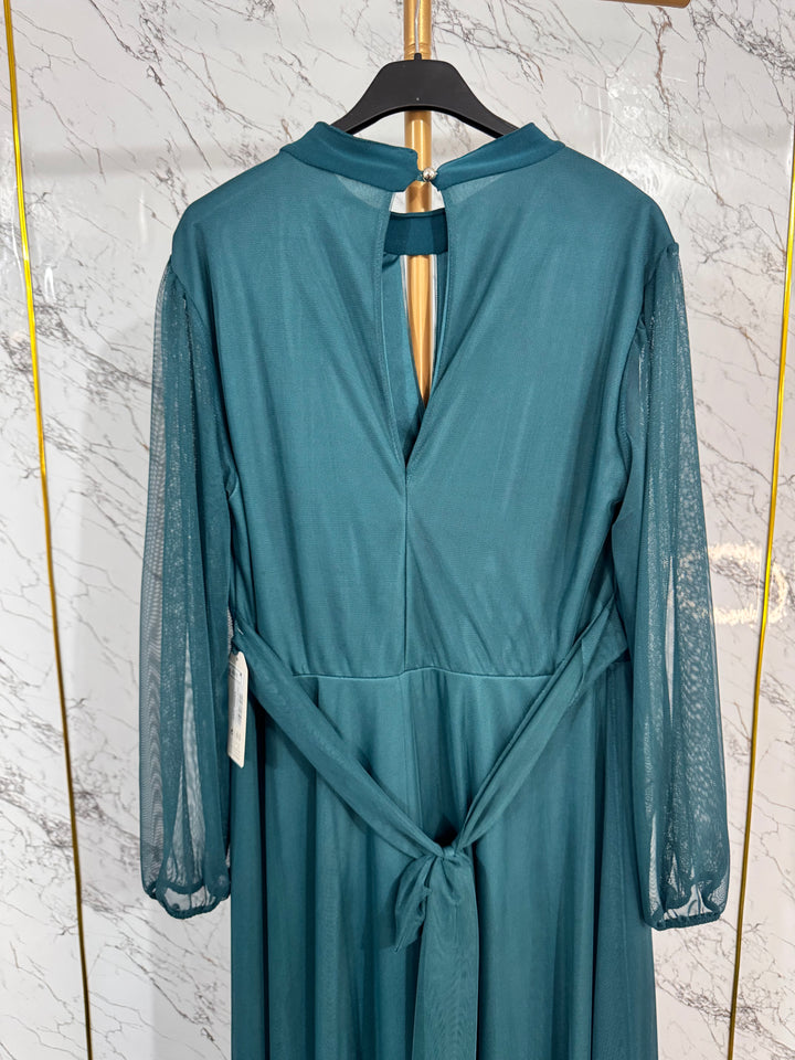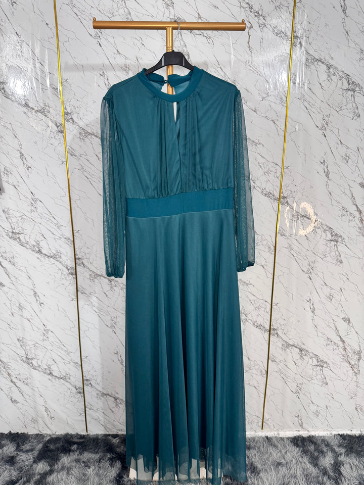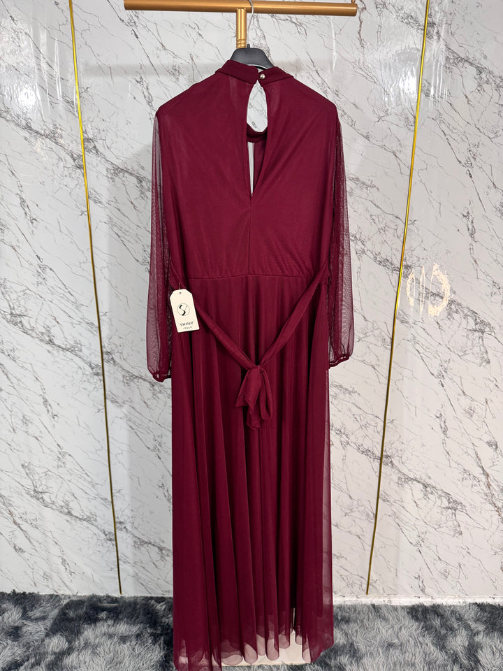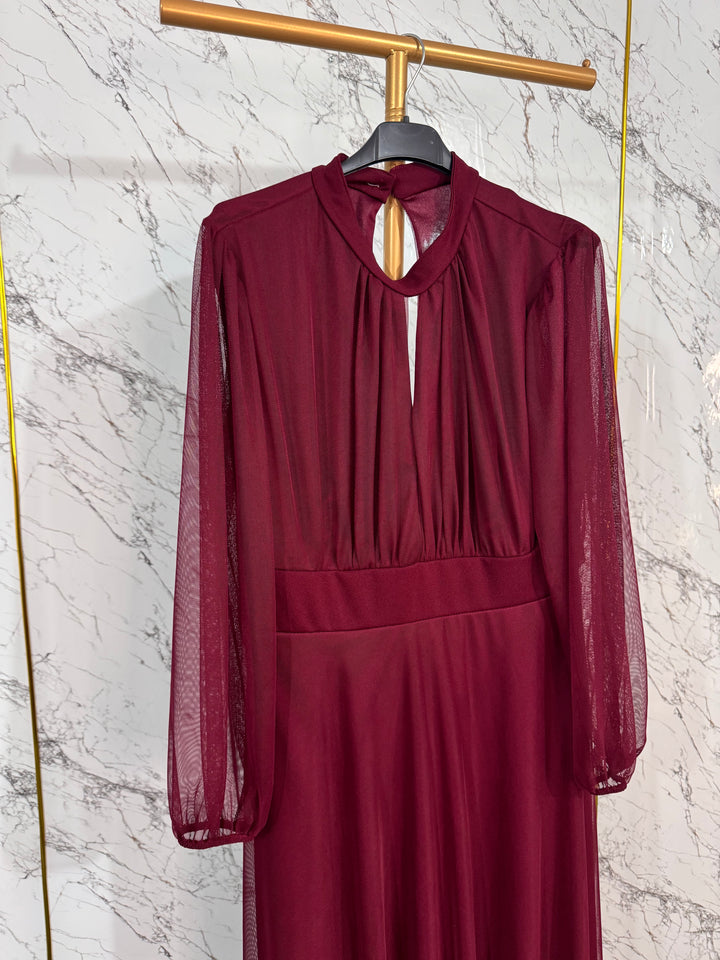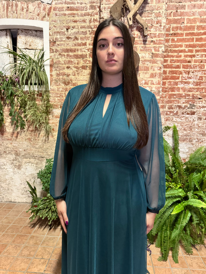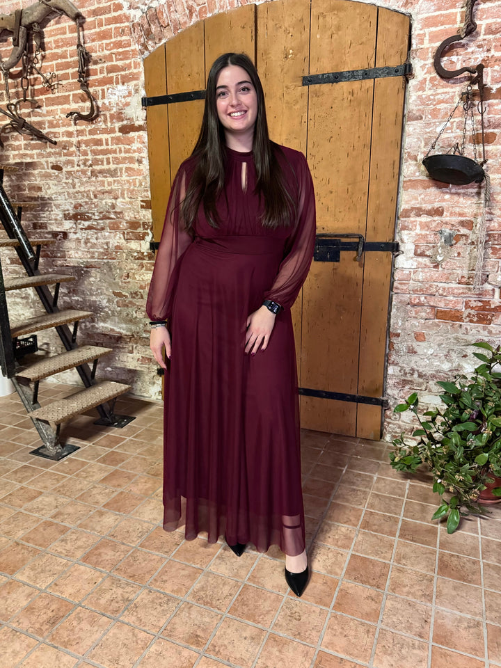 Abito in tulle con mezzocollo rotondo con apertura nello scollo, manica lunga velata con bottone in chiusura dietro, e cinturina in vita.