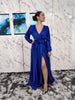 Abito con manica lunga ampia con elastico nel polso, scollo a incrocio, elastico in vita con cinturina inclusa, gonna ampia lunga e spacco profondo.