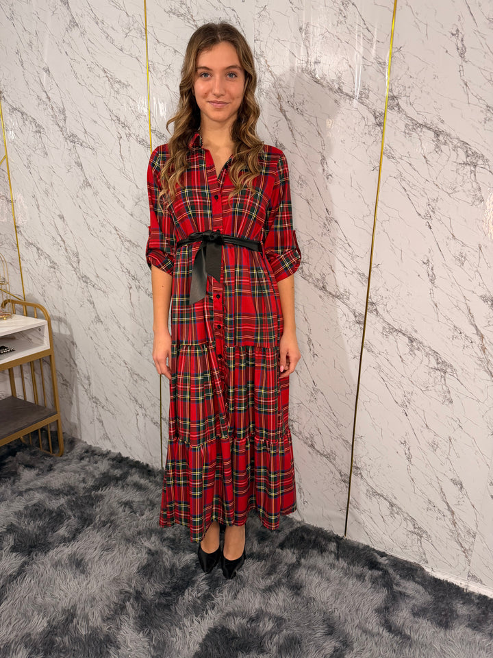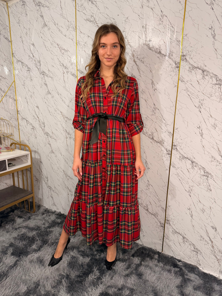 Abito chemisier lungo con fantasia scozzese, maniche lunghe con possibilità di risvolto.