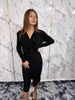 Abito midi arricciato con tessuto in lurex. Scollo a intreccio, manica lunga, drappeggio centrale nella gonna e cintura compresa in vita (estraibile).