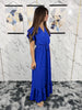 Abito lungo con manichette volant, scollo a incrocio, elastico in vita e balzetta sul fondo.