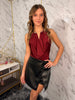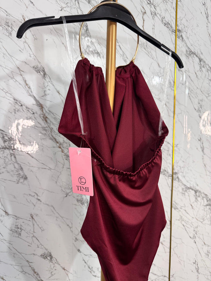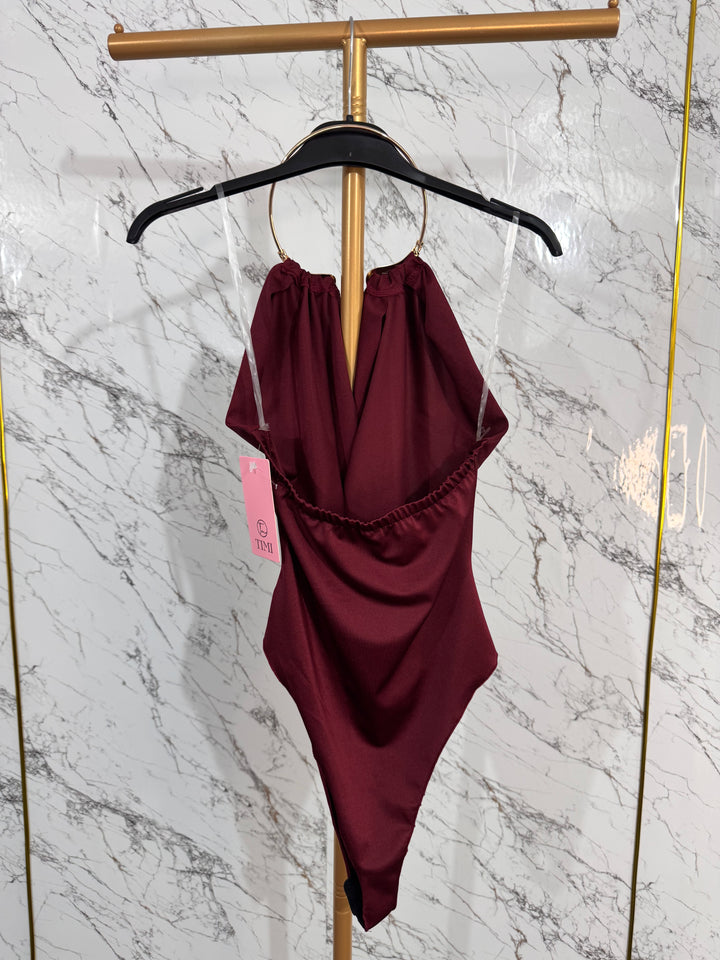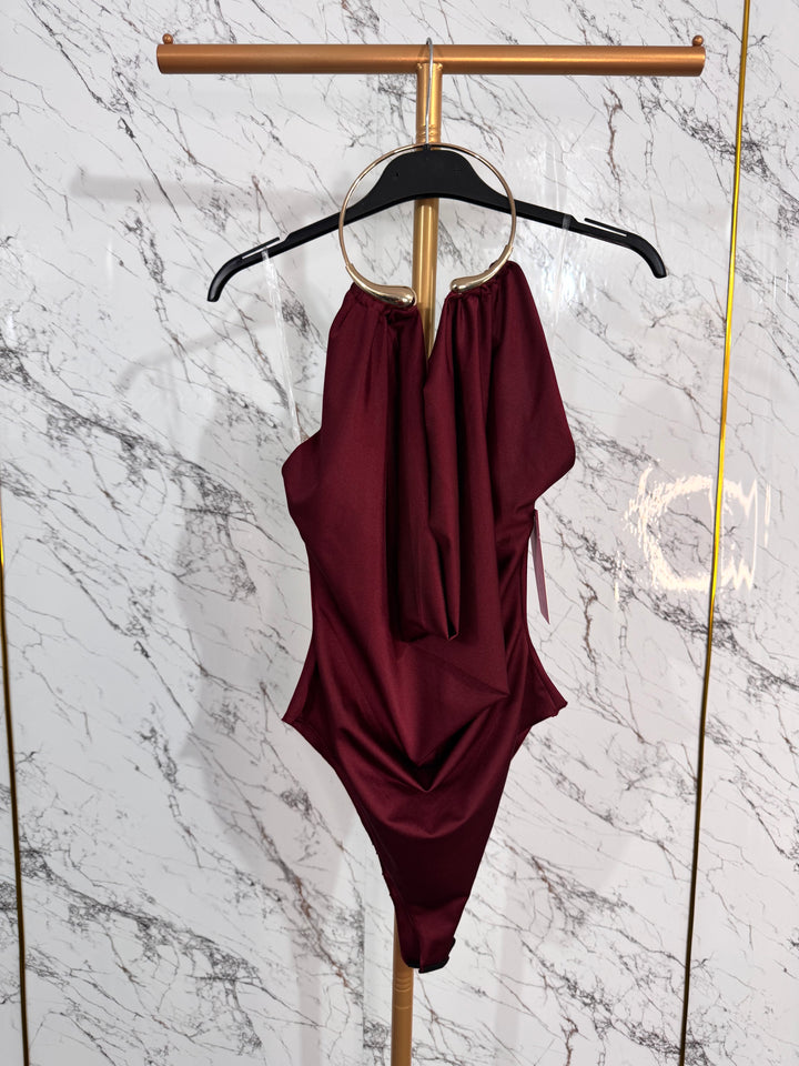 Body con collana gioiello nel collo , scollo a scialle, sgambato, con chiusura regolabile con tre gancetti, retro con schiena scoperta ed elastico in vita .