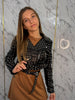Chiodo corto interamente borchiato, con fodera interna, tasche vere laterali. Cintura non estraibile.