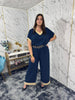 Coordinato composto da maglia mezza manica con profilo in beige e scollo a V , ed il suo pantalone con gamba a palazzo ed elastico in vita con profilo nel fondo in beige.