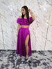Coordinato composto da top con lunghezza crop, scollo elasticizzato con balze vaporose, drappeggio elasticizzato nel retro, e gonna lunga con spacco e cinturone con elastico nel retro.