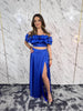 Coordinato composto da top con lunghezza crop, scollo elasticizzato con balze vaporose, drappeggio elasticizzato nel retro, e gonna lunga con spacco e cinturone con elastico nel retro.