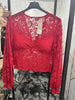 Crop top in pizzo con manica a sbuffo, coppette imbottite e scollo a V.