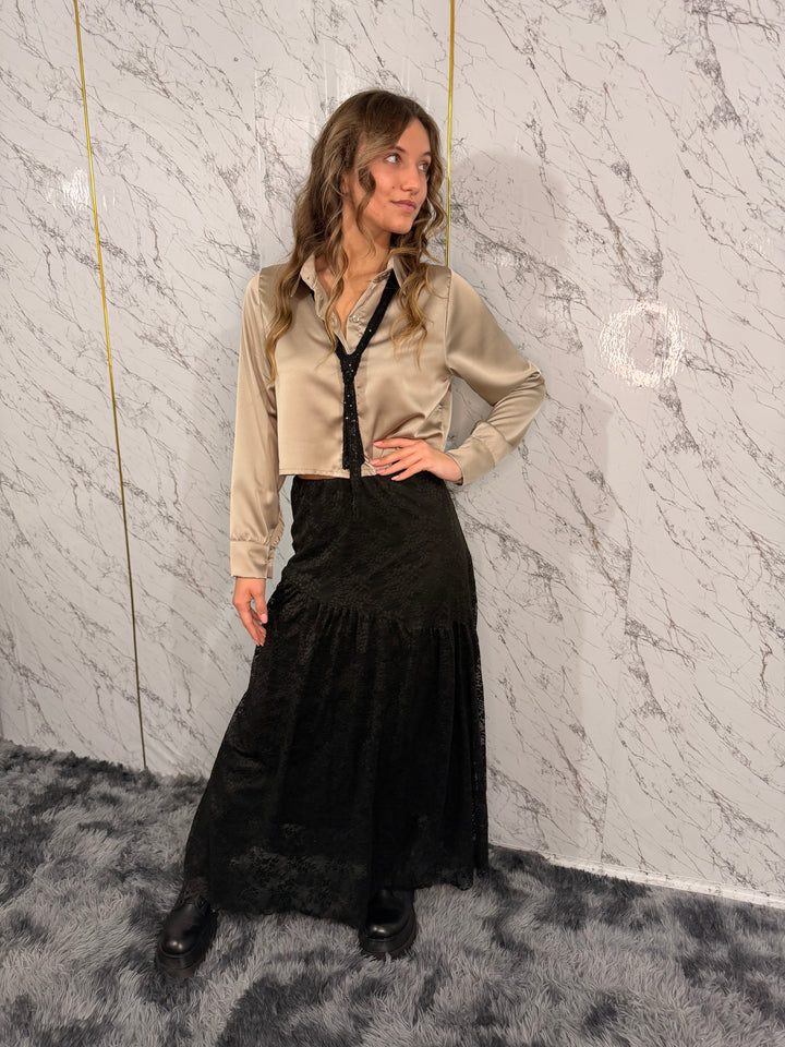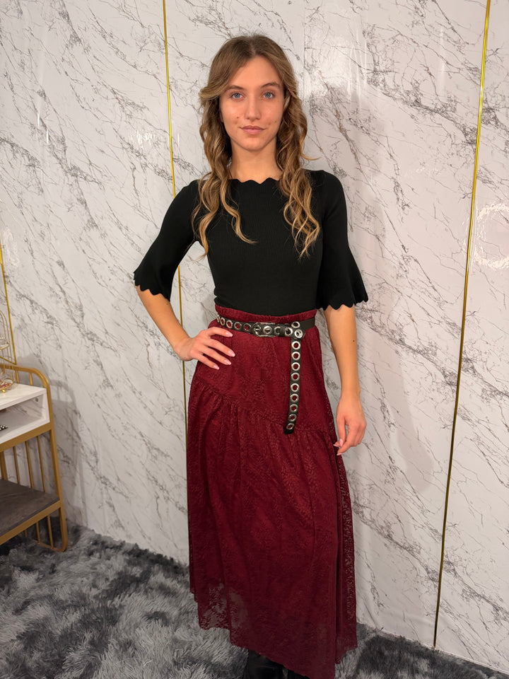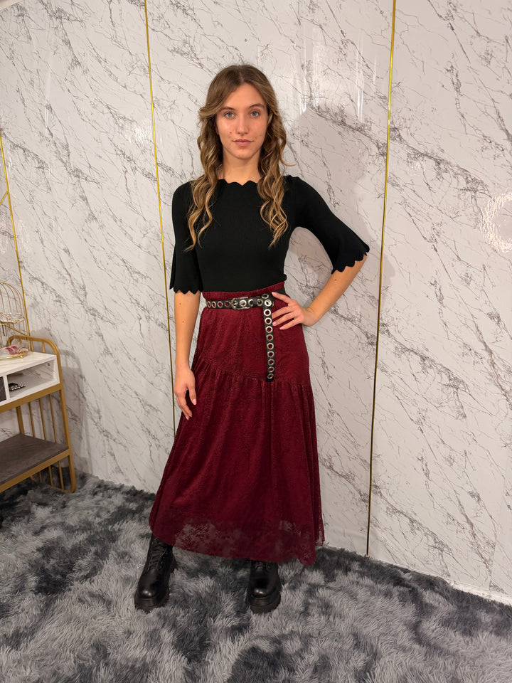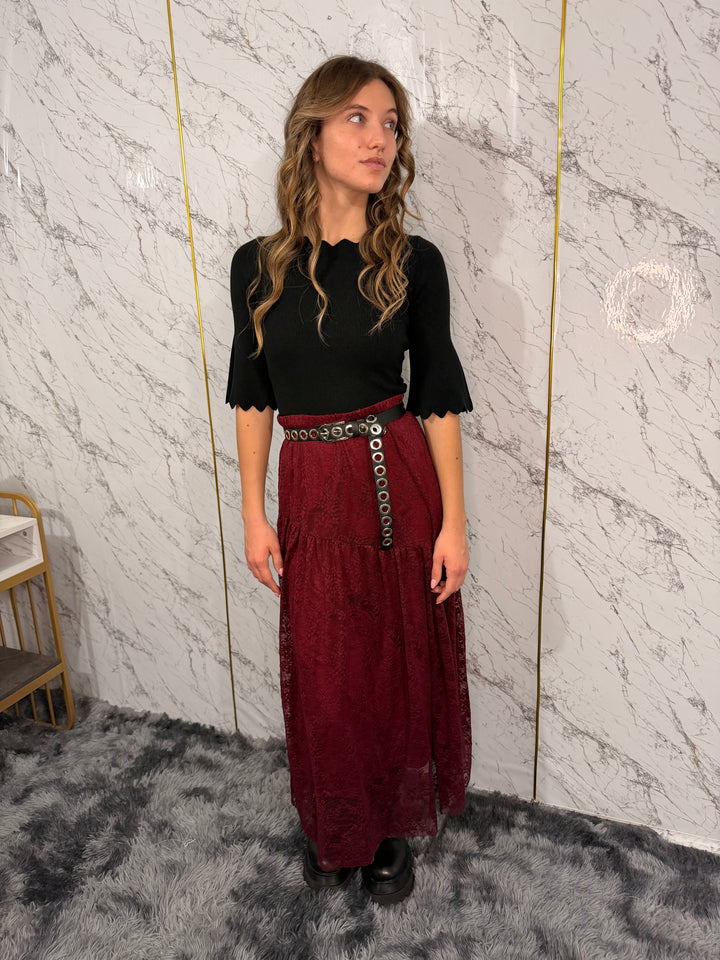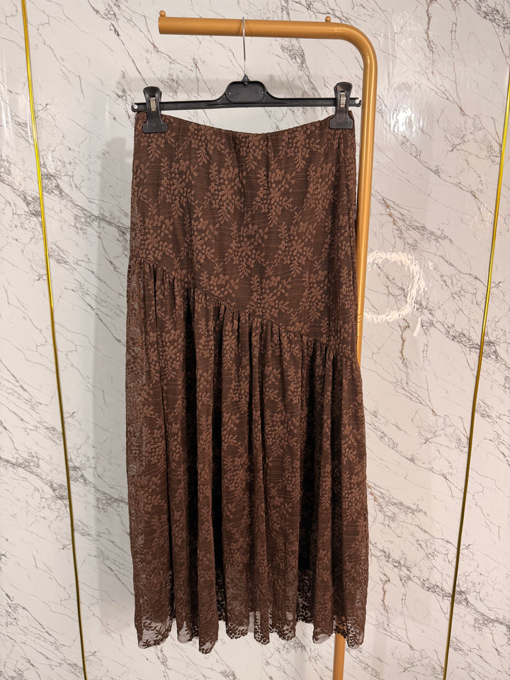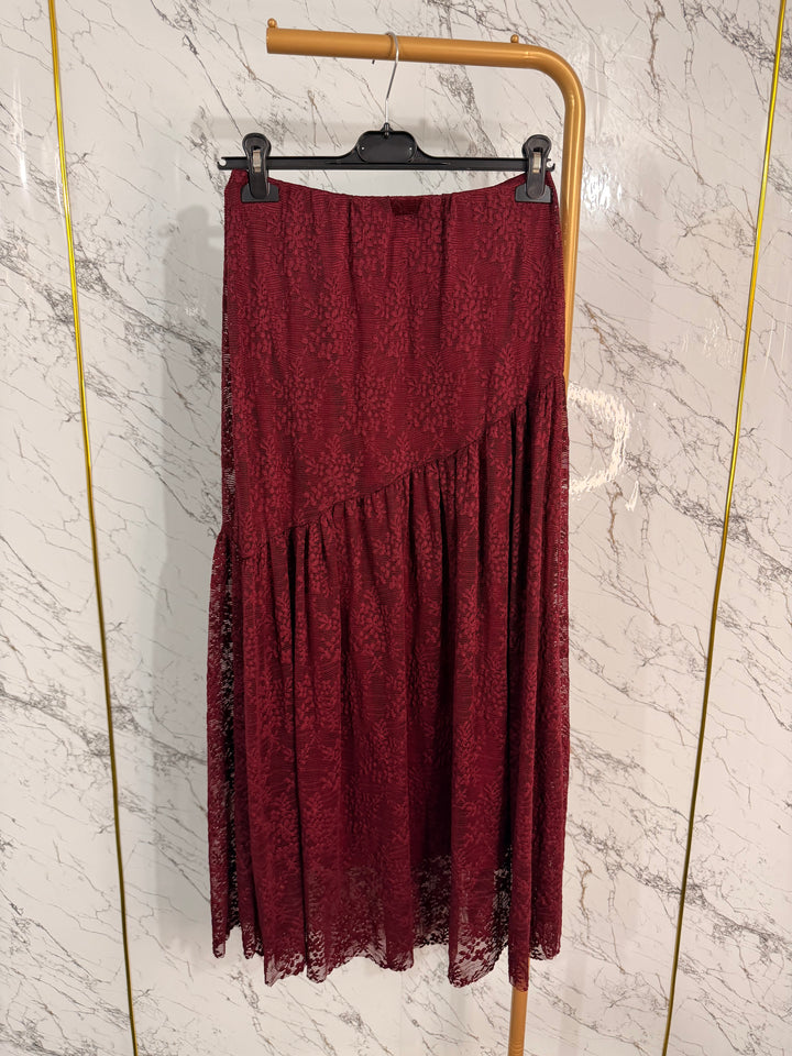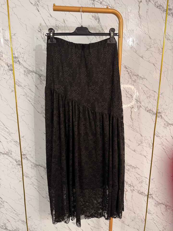 Gonna lunga in pizzo, con elastico in vita e taglio asimmetrico.
