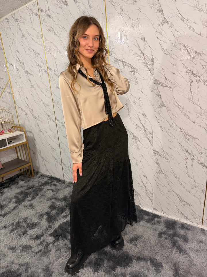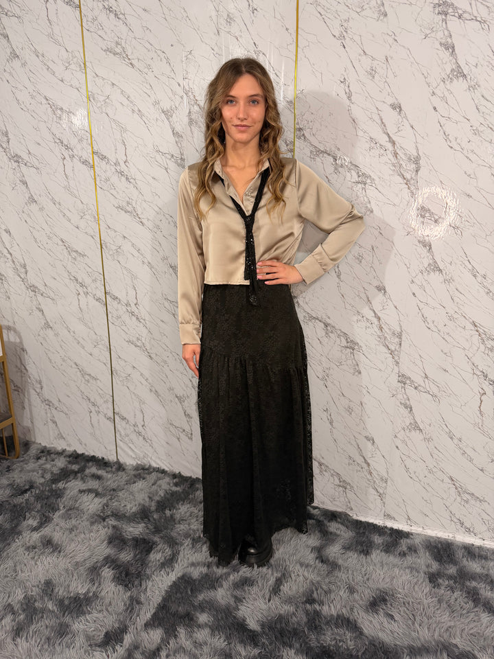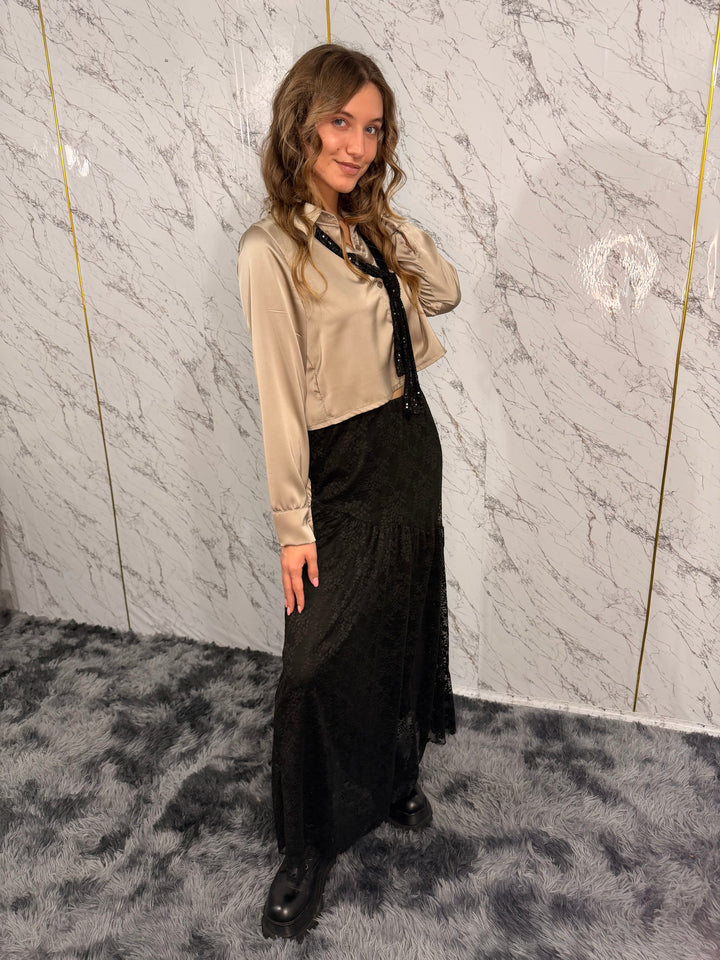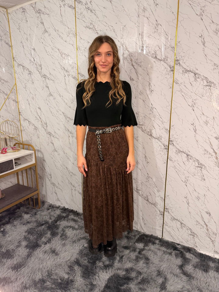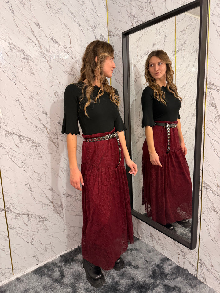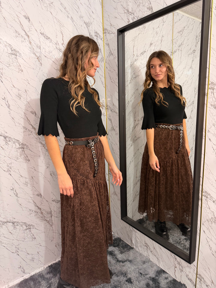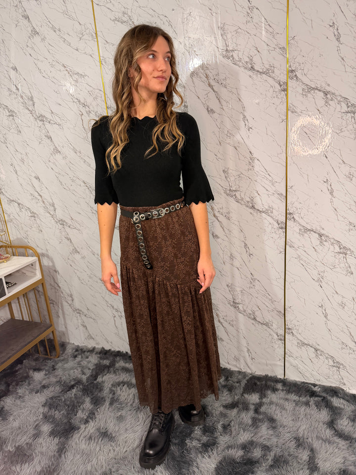 Gonna lunga in pizzo, con elastico in vita e taglio asimmetrico.