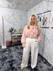 Pantalone palazzo con elastico dietro, passanti, tasche all’americana, pince, cinturina inclusa.