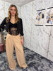 Pantalone palazzo con aperture e pince nel davanti, tasche all’americana, cinturone elastico nel retro.