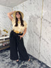Pantalone palazzo ampio con pince nel davanti, tasche laterali all'americana, elastico in vita nel retro e cintura inclusa.
