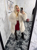 Pelliccia ecologica lunga foderata internamente con scollo abbondante, cintura in vita, tasche laterali e chiusura con tre bottoni automatici.