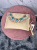 Pochette in rafia con dettagli di perline colorate nel davanti, chiusura con bottone automatico, fodera interna e gancetti laterali con inclusa la sua tracolla e cinghietta da mano.