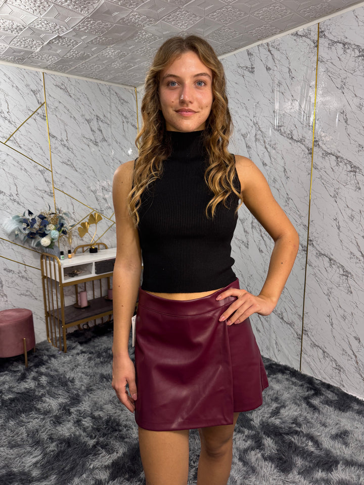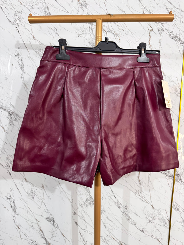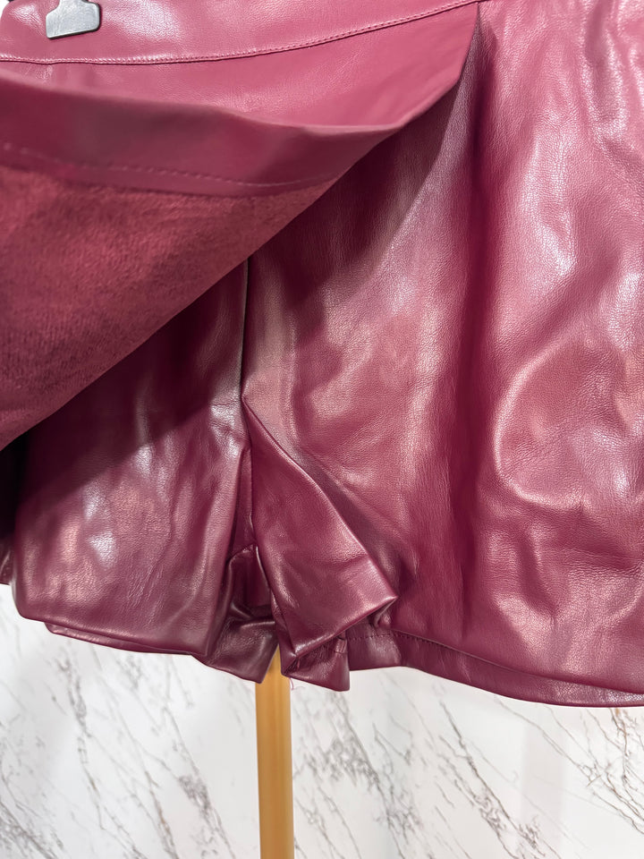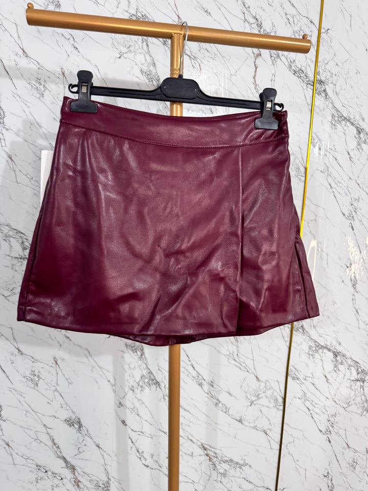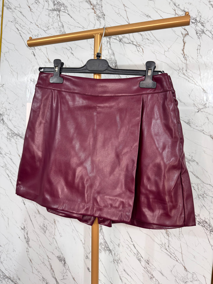 Shorts in ecopelle effetto gonna portafoglio, con zip laterale nascosta. Colore vinaccia.