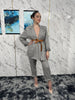 Tailleur gessato grigio, composto da giacca con spalline imbottite, foderata internamente, chiusura bottone centrale, e tasche a patta, e abbinato al suo pantalone con tasche laterali, elastico in vita e cinturina ecopelle inclusa.