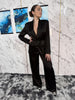 Tailleur in simil raso composto da giacca con spalline imbottite, tasche , cinturina compresa e pantaloni a palazzo con chiusura con patta e gancetto, tasche laterali e elastico nel retro.