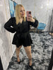 Tutina in simil raso con scollo a incrocio, ampia manica con polsino elasticizzato, spalline imbottite, elastico in vita con cinturina inclusa e pantaloncino ampio.