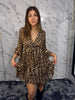 Abito corto con balza finale, manica a volant 3/4 , scollatura a incrocio con coulisse regolabile sotto il seno e foderato nel fondo.