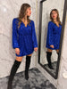 Abito ricoperto da paillettes, con manica a sbuffo, elastico in vita, fodera interna e scollo a incrocio.