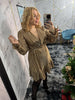 Abito metallizzato plissettato con balza nel fondo, scollo a incrocio ed elastico in vita.